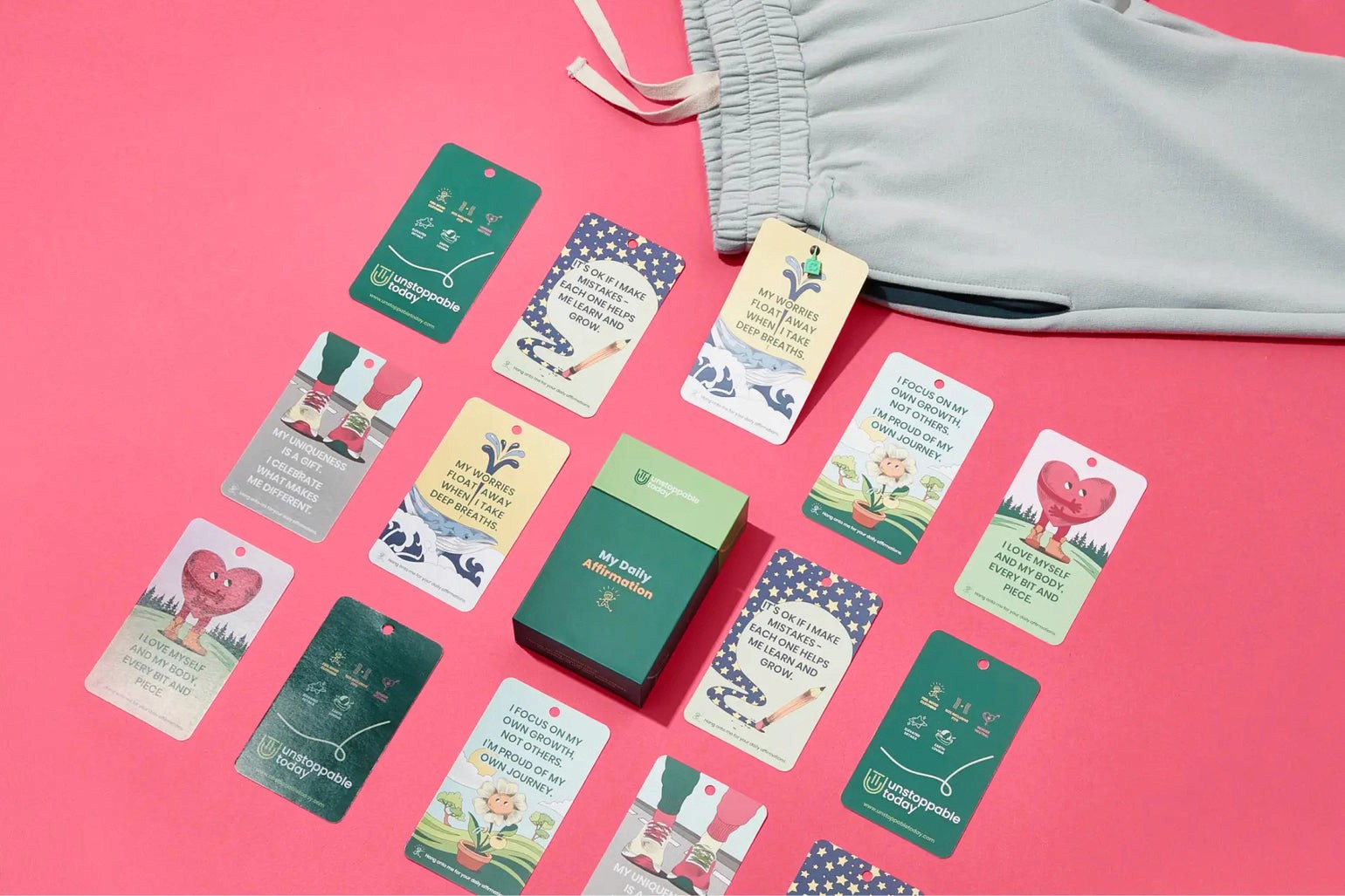 We've reimagined hang tags as more than just something to be thrown away; they now also serve a second purpose as daily affirmation cards. All of our hang tags have one of our illustrated affirmations on the back that is designed to spark conversations and inspire positive thinking. These cards can be collected and used as part of a daily routine between parents and children to discuss the importance of embracing their strengths and uniqueness and cultivate a mindset of resilience and positivity, counteracting the negative messages and comparisons that often stem from social media and societal pressures.